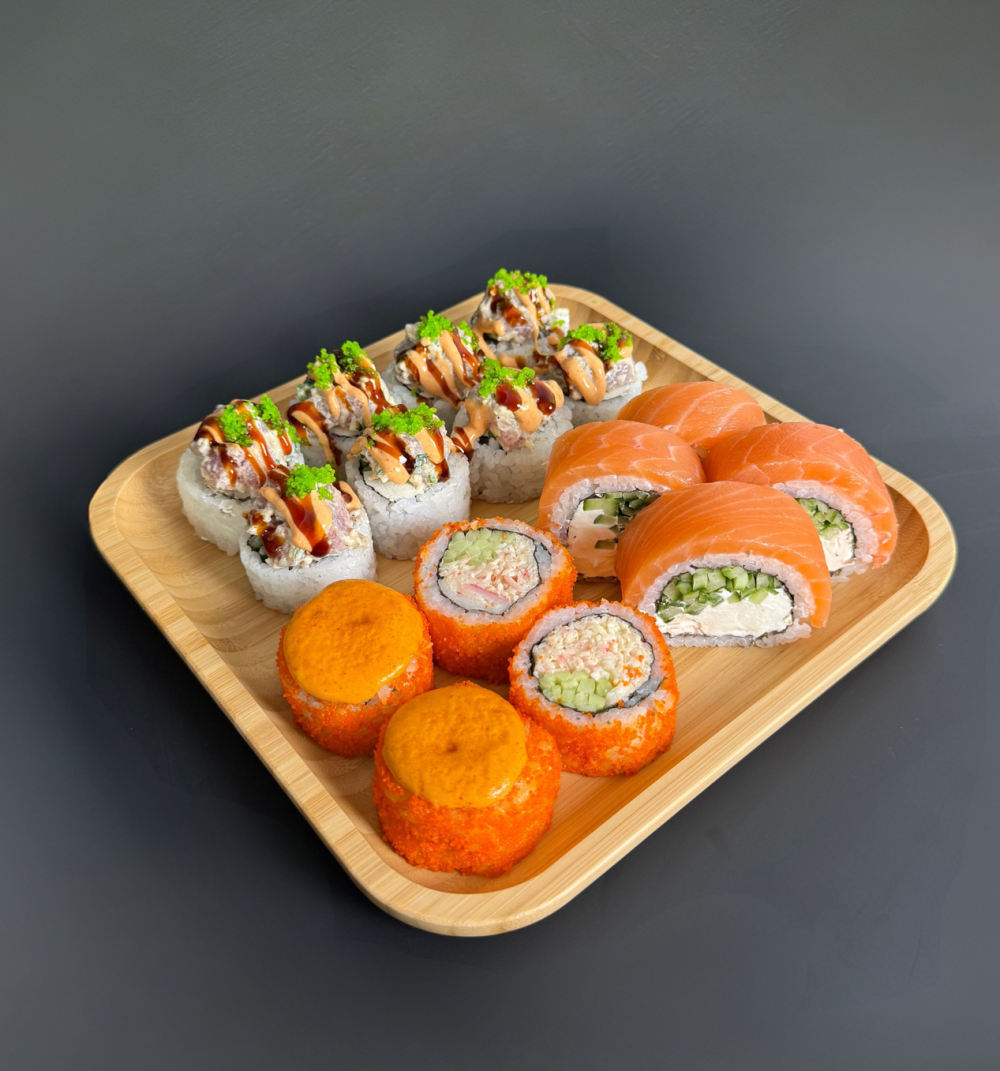 Запеченная Калифорния острая 4шт, Тунец тар-тар 8шт, Филадельфия 4шт, соевый 2шт, васаби 1 шт, имбирь 1 шт