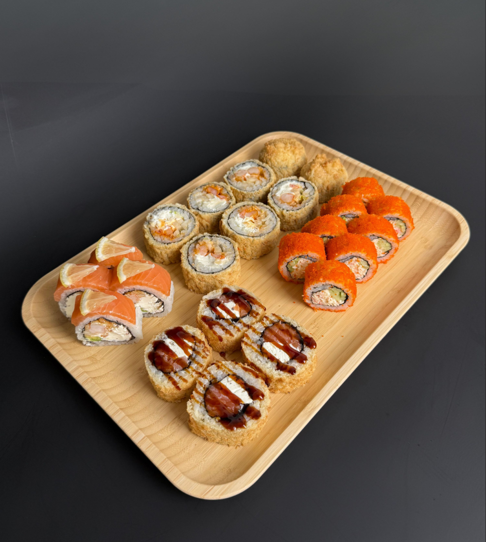 Лимонный 4шт, Темпура лосось с унаги соусом 4шт, Темпура креветка 8шт, Калифорния стандарт 8шт, соевый 2шт, васаби 2шт, имбирь 2шт