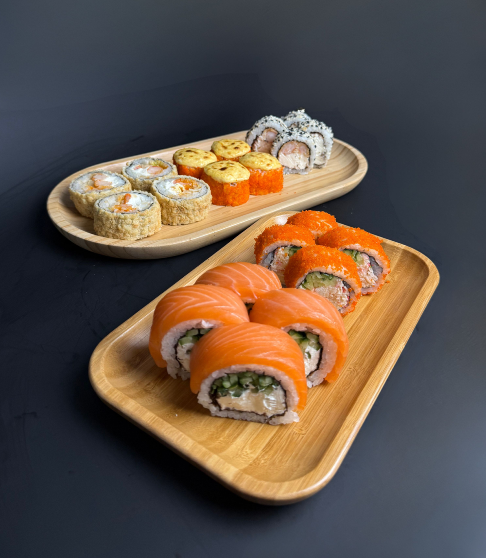 Филадельфия 4шт, Калифорния 4шт, Темпура креветка 4шт, Запеченный лосось 4шт, Ролл с жареной креветкой 4шт, соевый 2шт, васаби 2шт, имбирь 2шт