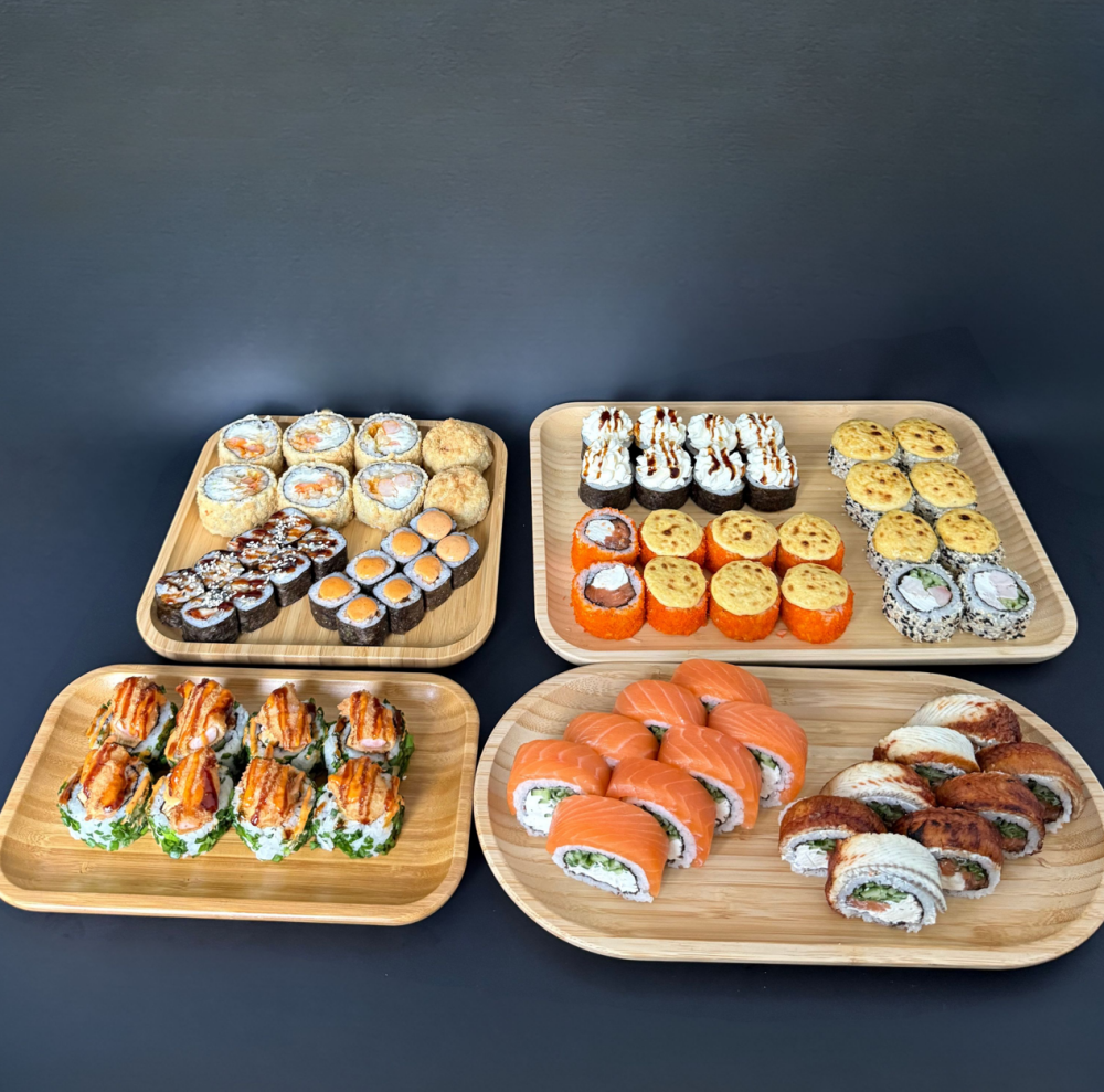 Филадельфия 8шт, Канада 8шт, мини с креветкой 8шт, мини с угрём 8шт, запеченный с лососем 8 шт, запеченный с угрём 8шт, темпура креветка 8шт, ролл рио 8шт, снежинка 8шт