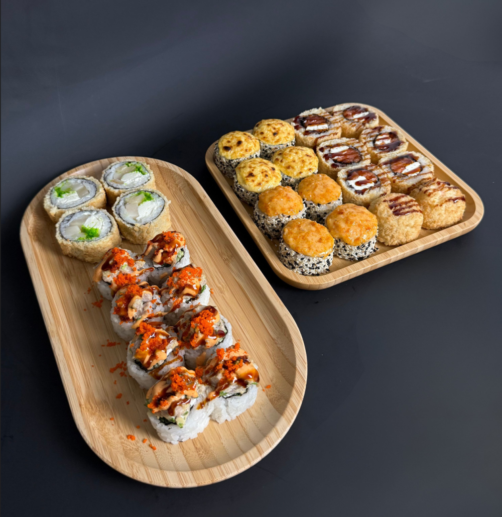 Запеченный эсколар 4шт, запеченный тунец тар-тар 8шт, запеченные друзья 4шт, темпура лосось с унаги соусом 8шт, темпура эсколар х/к 4шт, соевый 2шт, васаби 2шт, имбирь 2шт