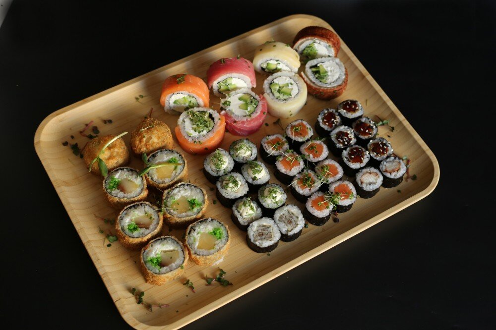 Радуга 8 Шт, Темпура Эсколар ХК 8 Шт, Мини Лосось 8 Шт, Мини Угорь 8 Шт, Мини Омлет 8 Шт, соевый 3 шт, васаби 2 шт, имбирь 2 шт