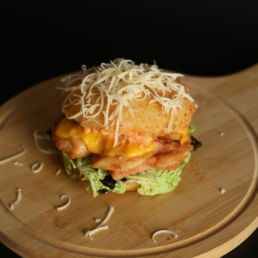 Лист салата, соус для запекания (чесночный), Куриное филе хк, сыр Чеддер, Спайси соус, Кляр, Сухари.