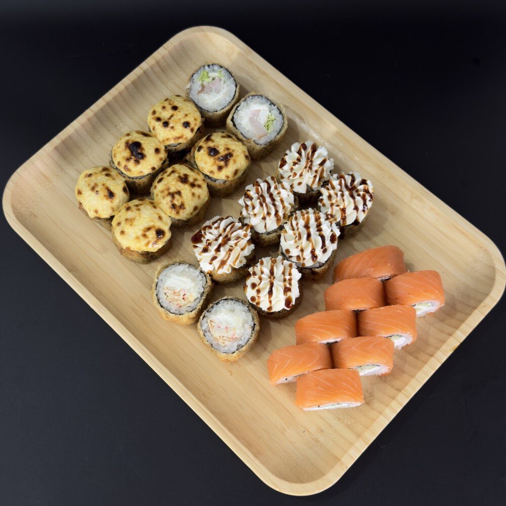 Филадельфия стандарт 8шт, Темпура сливочный стандарт 8шт, ЗП Цезарь стандарт 8шт, соевый 3шт, васаби 2шт, имбирь 2шт