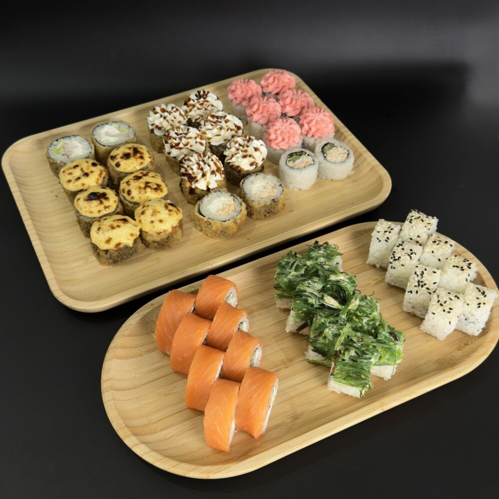 Филадельфия стандарт 8шт, Чука ролл с лососем стандарт 8шт, МР. Креветка стандарт 8шт, ЗП Цезарь стандарт 8шт, Темпура сливочный стандарт 8шт, Лава краб стандарт 8шт, соевый 4шт, васаби 3шт, имбирь 3шт